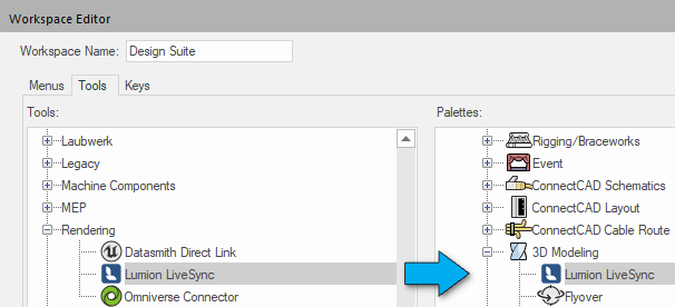 2.6: Drag the Lumion LiveSync entry from the Rendering category on the left to the 3D Modeling category on the right.