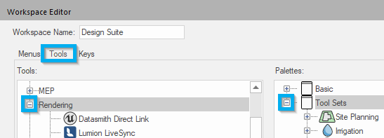 2.5: Click on the Tools tab in the Workspace Editor window, and then click on the [+] button to expand the Rendering category on the left and the Tool Sets category on the right.