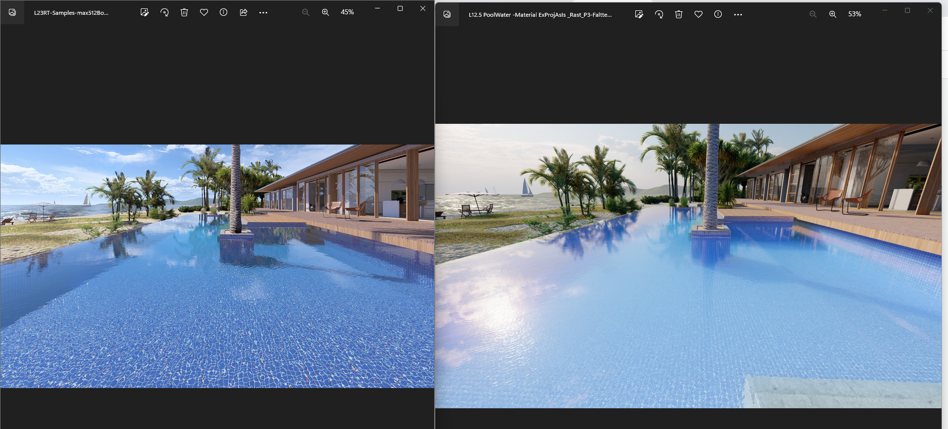 Or export a MaterialID Map for the Rasterization render and use an image editor to select the pool surface and copy/paste that selection of the Rasterization render into the Ray Traced render.