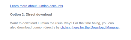 4. If you use Option 2: Direct Download' then please don’t forget to go back to Option 1 and create your Lumion Account, as that will be the go-forward provision for accessing Lumion updates, forums, and other services.