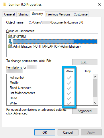 3.2. To do that, please browse to each one of those folders above. Then, Right-click them, select Properties and click on the Security tab. Your Windows User Account must have full read/write permissions for these folders and for all sub-folders: