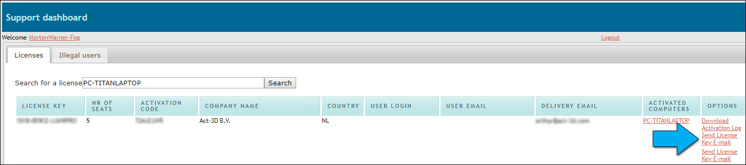 3. Then click on ‘Send License Key E-mail’ on the Support Board page: