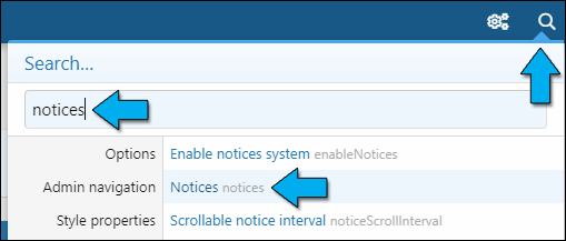 2.1 After logging in as an administrator, please click on the search button in the top right corner, type ‘notices’ in the search field and click on the Notices option: