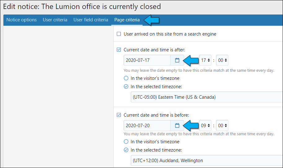 2.3 Click on the Page criteria tab before clicking on the ‘after’ and ‘before’ calendar buttons: