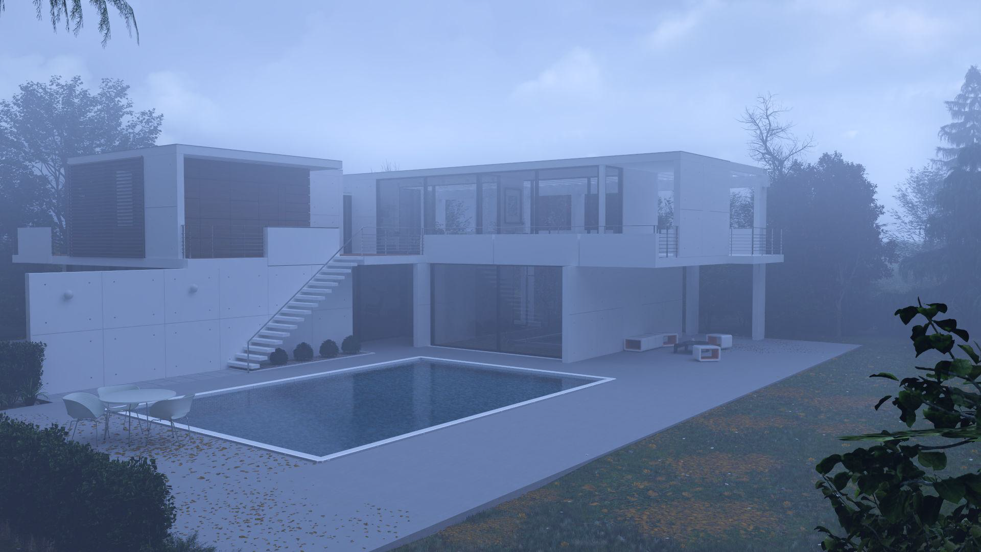 An example of regular fog. Both the sky and sun affect the fog illumination. Because of the overcast sky the sun has less influence in this render.