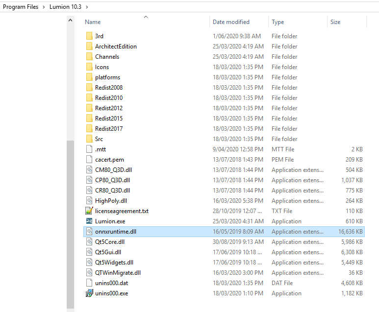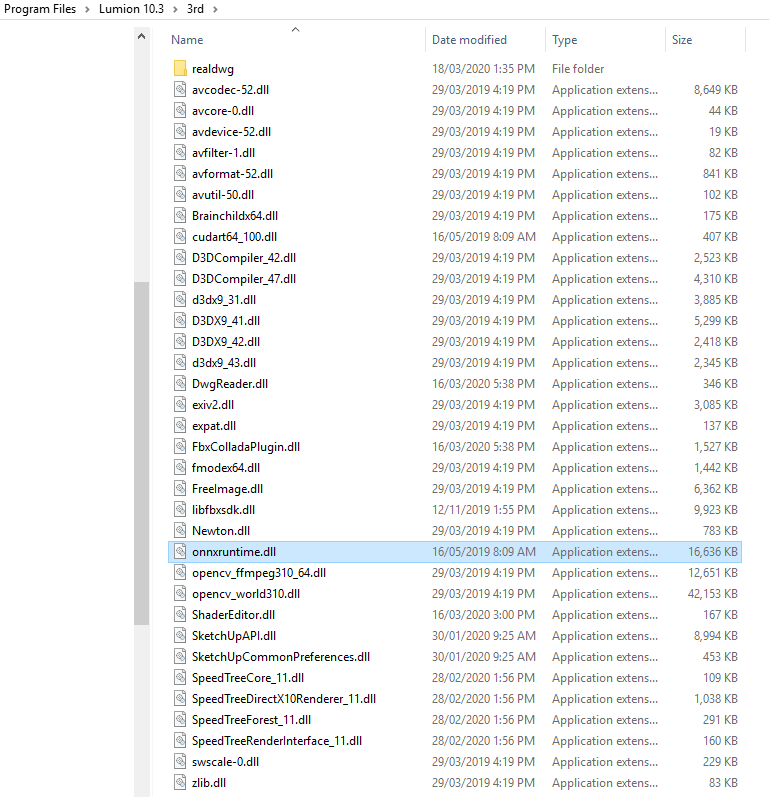 3.2. Move the file onnxruntime.dll from the Lumion install (usually C:\Program Files\Lumion 10.x\3rd) folder to the root folder where Lumion.exe is located (usually C:\Program Files\Lumion 10.x).